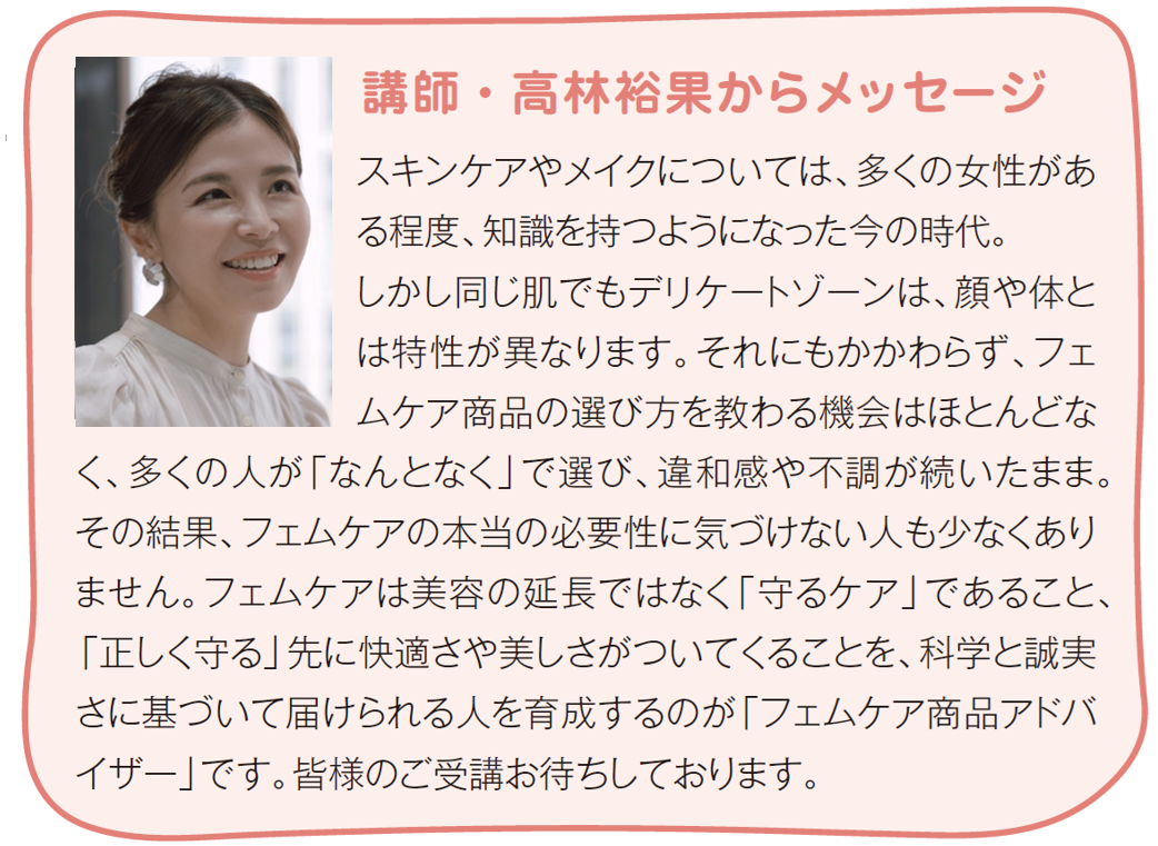 最新の医学知見をふまえた日常ケアの視点から「根拠をもって安全に選べる力」を持つこと。中立的な立場で、ただ売れるもの、流行りものを勧めるのではなく、フェムケアは美容ケアの延長ではなく「守るケア」であることを伝えられる。そして、「正しく守る」視点の先に、快適さや美しさがついてくることを科学と誠実さに基づいて届けられる人材を育成します。